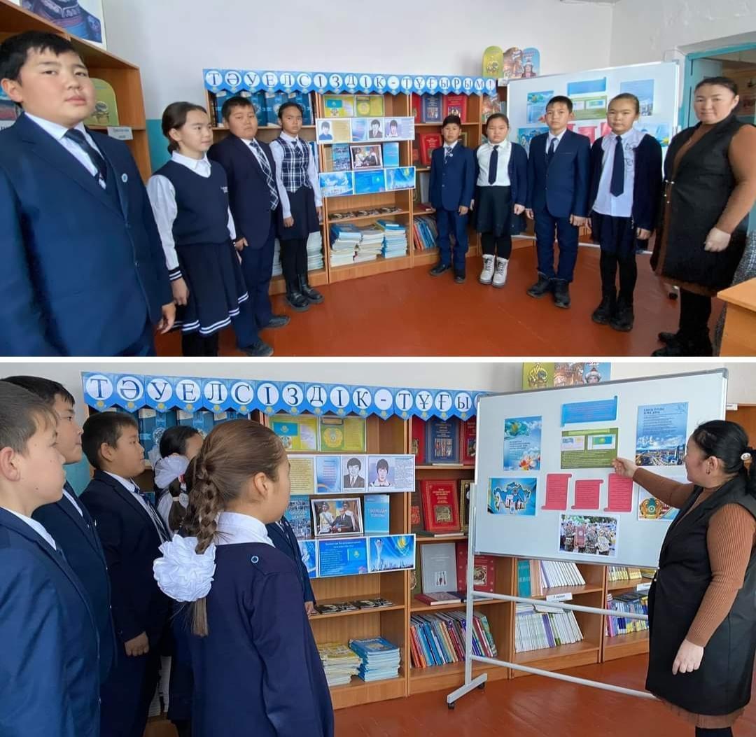 Мақсаты: Ата - бабамыздың тәуелсіздік жолындағы ерлігін үлгі етіп, Тәуелсіздік алғаннан кейінгі Қазақстанның дербес мемлекет ретінде қалыптасу тарихына шолу жасау, өскелең ұрпаққа тәуелсіздік ұғымын кеңінен түсіндіріп, насихаттау.Көрме жанында мектеп оқушылары тәуелсіздік туралы тақпақтарын жатқа айтты.