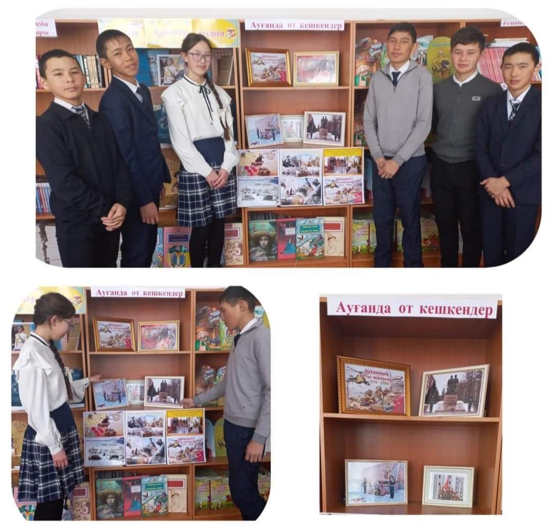 | 2024 жылдың 7 ақпан күні Алғазы орта мектебінде Кеңес Одағы әскерлерін Ауғанстан жерінен шығарылуының 35 жылдығына орай кітап көрмесі жоғары сынып оқушылары арасында ұйымдастырылды. |